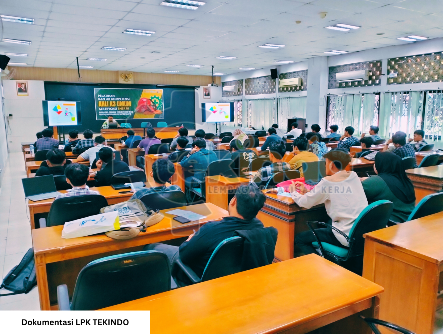 LPK TEKINDO bekolaborasi dengan Program Teknik Mesin Universitas Muhammadiyah Yogyakarta, belum lama ini menggelar acara “Pelatihan dan Uji Kompetensi Ahli K3 Umum Sertifikat BNSP RI” bersama mahasiswa dan Karyawan Universitas Muhammadiyah Yogyakarta. Kegiatan yang dilaksanakan di akhir tahun 2024 ini digelar di Gedung Siti Walidah Lt.2, Ruang Stadium General UMY pada tanggal 26 sampai dengan 28 Desember 2024.. Pelatihan diikuti oleh 40 peserta yang terdiri dari 38 mahasiswa dari prodi Teknik Mesin, 1 mahasiswa dari prodi Komunikasi , dan 1 karyawan dari prodi Agribisnis.